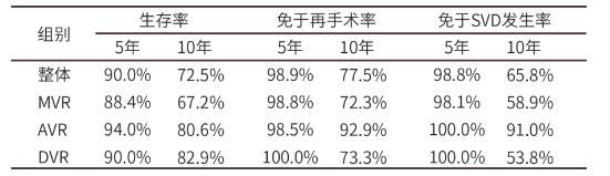 MVR组和DVR组虽然10年时相比5年时有下降,但通过进一步年龄分层,观察到10年时发生SVD的患者主要集中<50岁年龄段的年轻群体中,而该研究的随访群体<50岁病例数量占到1/3,提示在<50岁人群中尚需谨慎评估使用生物瓣相比于机械瓣的临床获益。本组病例还包括6例三尖瓣置换患者,最长12年,瓣膜功能均未见异常。