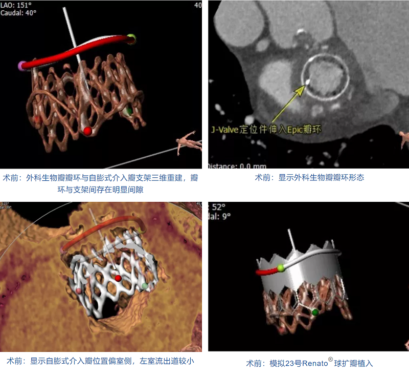 经过手术团队充分讨论病例资料,模拟在首次手术生物瓣环与第二次手术瓣膜内植入定位更精准的佰仁Renato®球扩式瓣中瓣,以有效治疗二尖瓣瓣膜毁损并消除自膨瓣与外科瓣之间的瓣周漏。为达到预期疗效,该病例要求球扩瓣释放位置非常精准,支架带覆膜部分需要精准覆盖原介入瓣与原生物瓣瓣环间的空隙以消除瓣周漏和反流,过于偏心室侧容易加重左室流出道阻挡,过于偏心房侧增加移位风险。同时,由于既往植入的生物瓣与介入瓣两个瓣膜都是小规格,需要Renato®球扩瓣具有较强的径向支撑力,扩张既往植入同轴性欠佳的介入瓣支架,才能确保术后相对理想的开口面积和跨瓣压差,对手术团体及球扩瓣表现均提出了较高的要求。