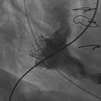 术前经详尽评估患者病情,通过CT重建测量既往植入的两枚瓣膜位置关系、瓣环直径、左室流出道面积等。可见自膨瓣位置偏向心室侧,支架未置于首次置入的生物瓣瓣环内,支架与瓣环间存在明显间隙,由于第二次置入的介入瓣位置过于偏心室侧,左室流出道面积在收缩末期仅为115.5mm²,且自膨瓣支架部分触及室间隔,但术前超声提示左室流出道流速尚可。
