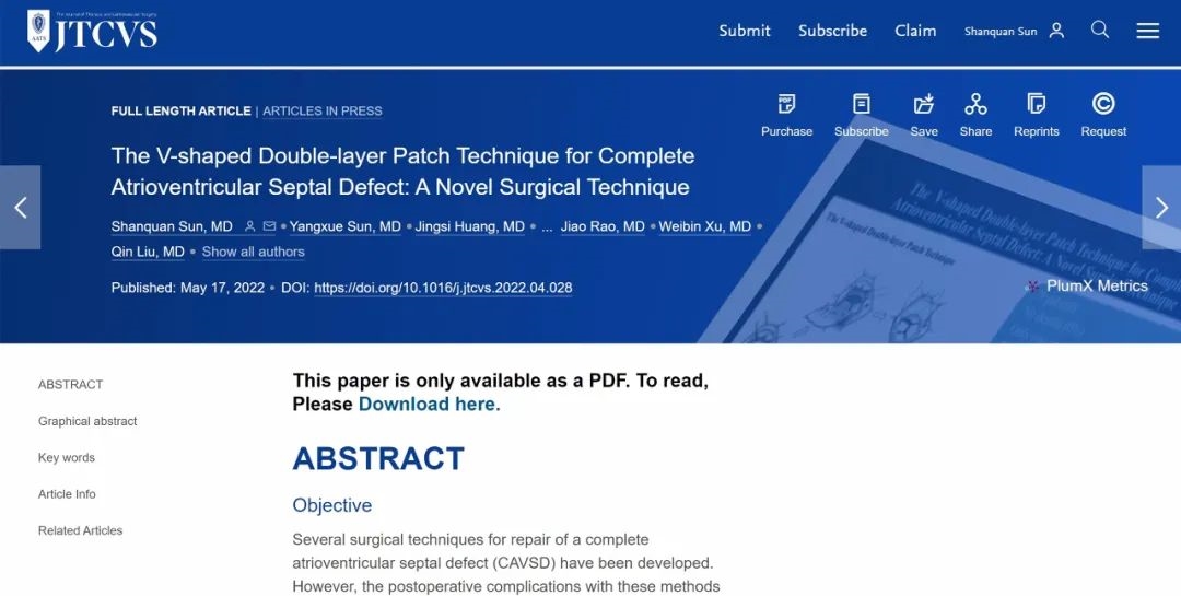 2022年5月17日美国《胸心血管外科杂志》(The Journal of Thoracic and Cardiovascular Surgery, JTCVS)在线发表了广东省妇幼保健院心脏中心孙善权主任团队的论文“The V-shaped Double-layer Patch Technique for Complete Atrioventricular Septal Defect-A Novel Surgical Technique”(译:《V形双层补片法治疗完全性房室间隔缺损——一种新的手术技术》)。此次论文刊发后,立刻吸引了国际同行的广泛关注。
