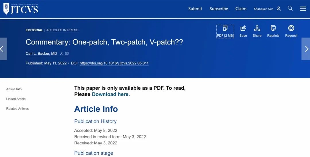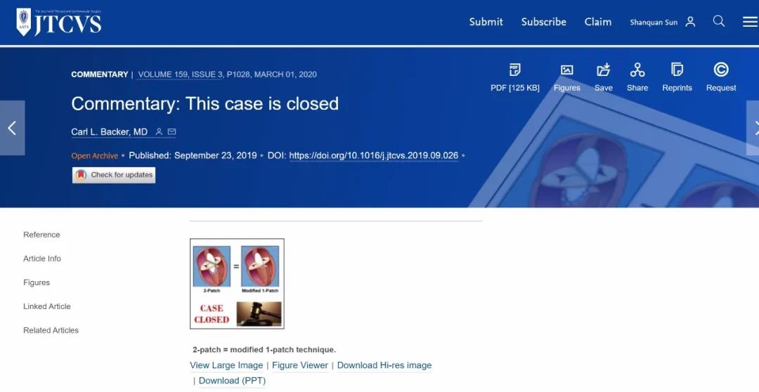 5月17日,《“V”形双层补片法修补完全性房室间隔缺损》的论文在线发表之前,5月11日国际先天性心脏病外科著名权威Carl L.Backer教授就已经在线发表了一篇关于“V形双层补片法”的评论“One-patch,Two-patch,V-patch??”(译:《单片法,双片法,V形补片法??》),评论首先指出“这篇论文的作者阐述了使用“V”型补片法这一前所未有的手术技术治疗完全性房室间隔缺损,这种新术式加固了左侧房室瓣,5年随访疗效显著。并提到他在2019年的评论文章“This case is closed”,满怀期待地评论道“由此可见,现在有了另一种选择,关于“双补片法vs改良单补片法”的辩论,终于到了该结束的时候了”。