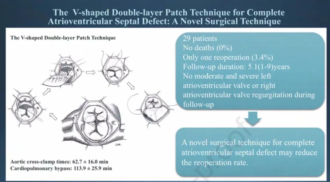 “V”形补片法一经发布,即被国际学术界公认为是一种“前所未有”的全新的手术技术, Carl L. Backer教授评论道“ 我之前在2020年的评论中提到过,双片法和改良单片法都存在左AV瓣关闭不全,在澳大利亚的两个队列研究中,均有10%的患者需要后期左AV瓣再手术,如果使用作者所描述的v形补片法可能有助于改善这一结果”。Carl L. Backer教授回顾他在“This case is closed”一文中认为“改良单片法与双片法已经是成熟的技术,都具有非常优秀的治疗结果”,“今后左侧房室瓣的修复是两种手术技术的关注重点”。Carl L. Backer教授在“One-patch,Two-patch,V-patch??”一文中给予了“This is a novel technique which has not been described before(这是一个从未被描述前所未有的技术)”,并认为已经尘埃落定的手术治疗方法,被“V”形补片法的出现所打破,该结束持续已久的“改良单片法vs双片法”之争论,完全性房室间隔缺损手术治疗可能进入了新的时期。