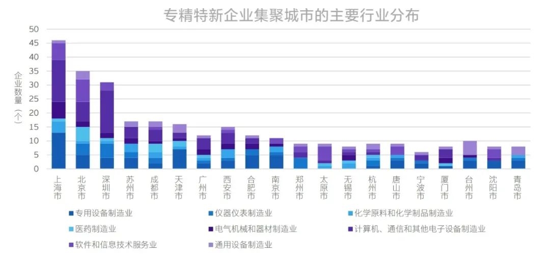 各城市的行业分布也显示出一定的地区特色。以拥有专精特新企业数量最多的三大城市上海、北京、深圳为例:上海市的优势行业为计算机、通信和其他电子设备制造业以及专用设备制造业;北京市则在软件和信息技术服务业以及医药制造业分布上领先于其他城市;深圳市则在计算机、通信和其他电子设备制造业集中布局。