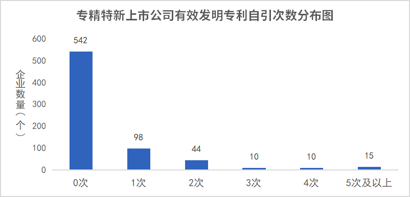 不难发现,在719家样本公司中,仅有177家公司有专利自引用行为,专利自引用次数在5次及以上的公司仅有15家,占比仅2%。专精特新企业整体呈现出的低自引率反映出企业在技术深度上存在的问题。