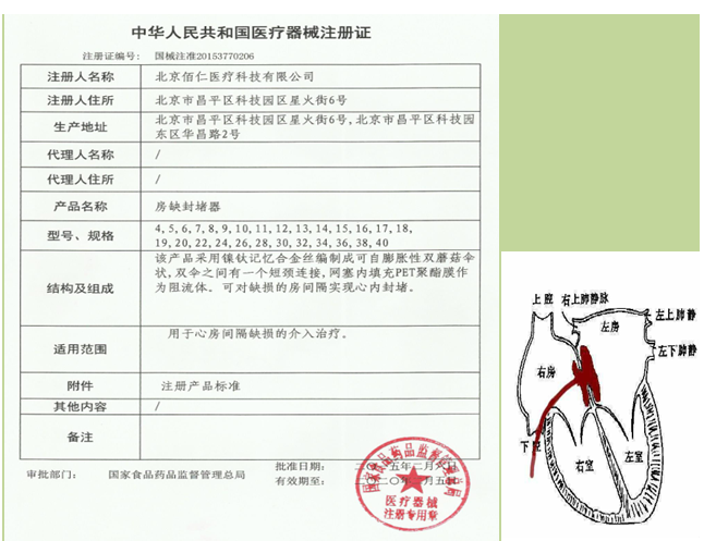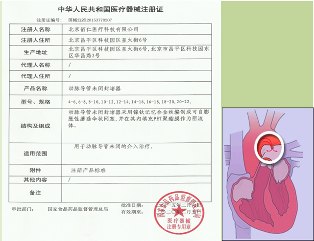 佰仁医疗封堵器2002年正式立项开始研究;动脉导管未闭封堵器2004年12月27日试产注册,房缺封堵器2005年9月20日试产注册,两产品均于2007年3月6日准产注册,目前第三次注册换证为2015年2月6日,有效期至2020年2月5日。 室缺封堵器目前已完成临床试验,即将报批CFDA注册。